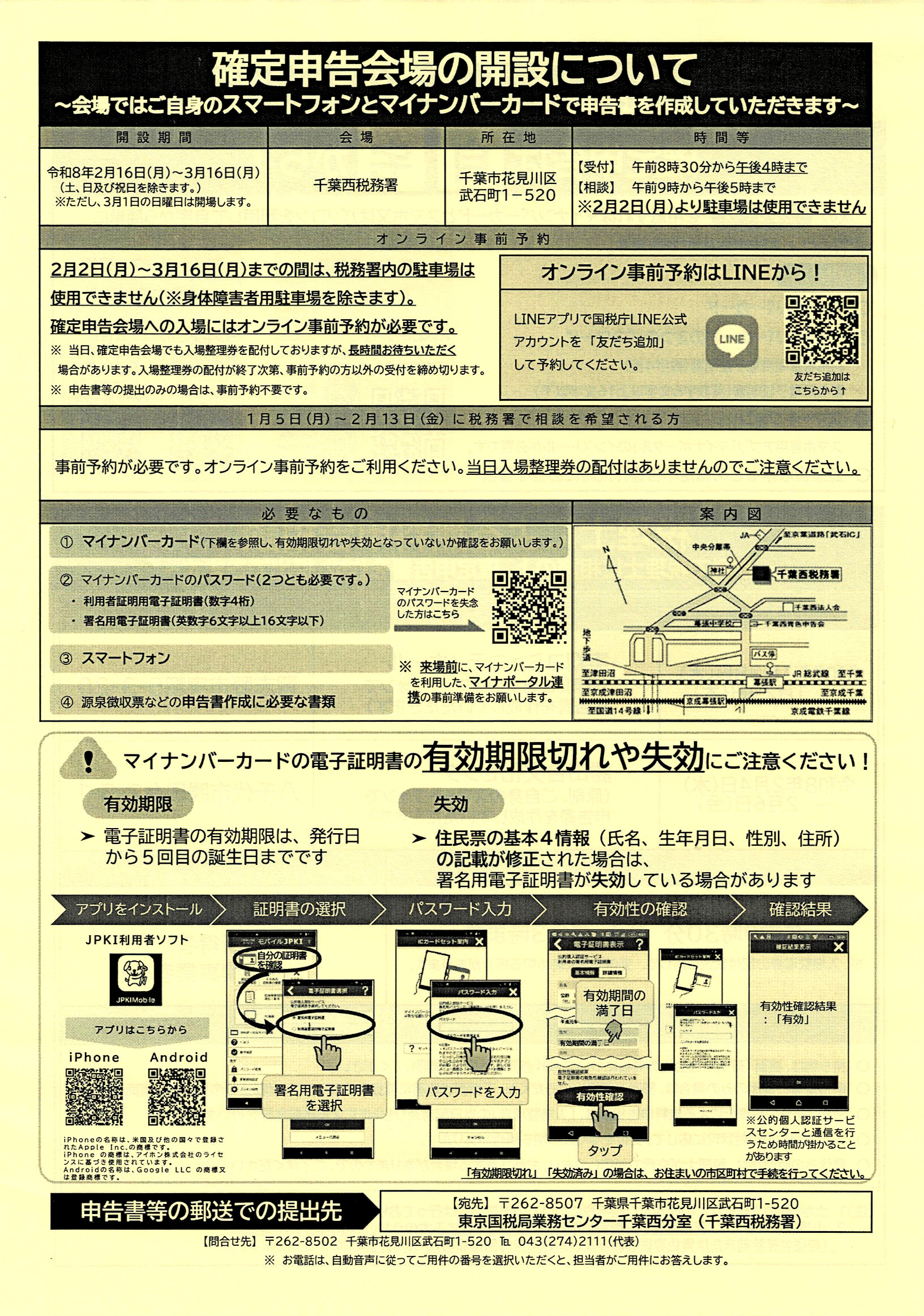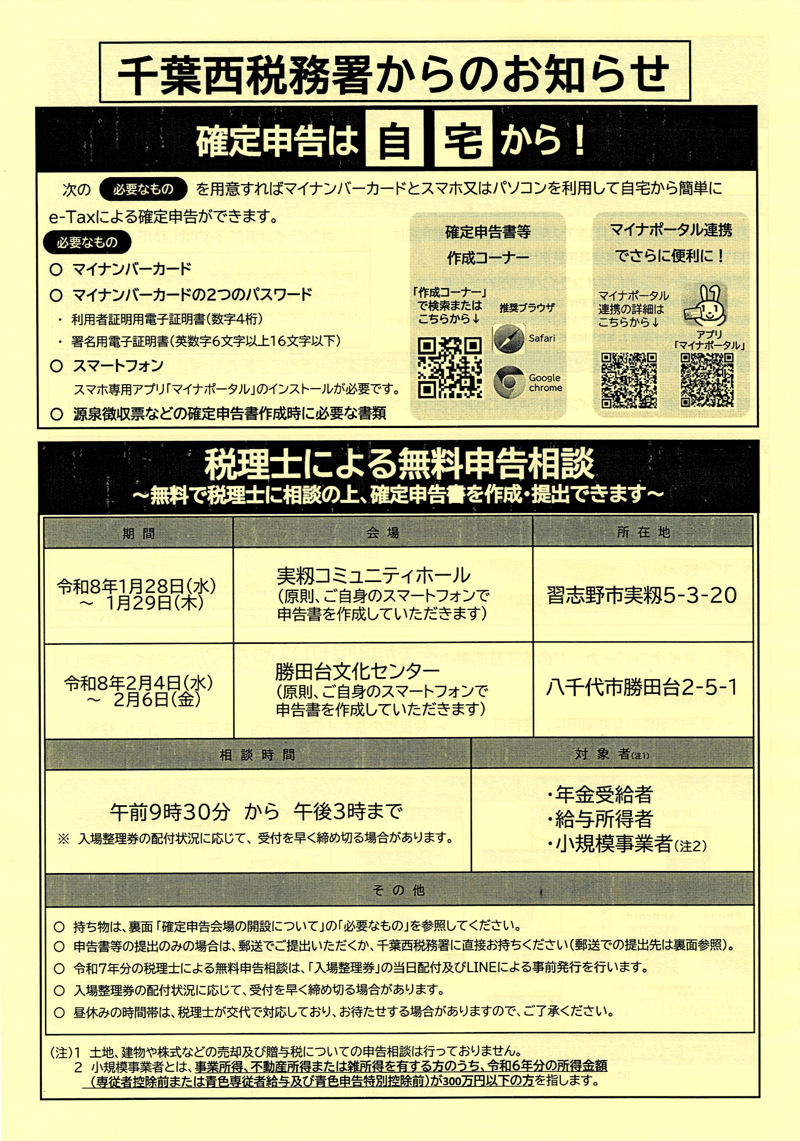 千葉西税務署からのお知らせ(2026年) 2025年12月16日2025年12月16日 イベント・講演会 自治会回覧 確定申告の時期にあわせ、千葉西税務署による無料申告相談を実施します。マイナンバーカードとスマートフォンを使用し、税理士のサポートを受けながら申告書の作成・提出ができます。対象は年金受給者、給与所得者、小規模事業者の方です。実籾コミュニティホールおよび勝田台文化センターで開催され、参加は無料です。また、千葉西税務署では申告会場を開設し、入場にはオンラインによる事前予約が必要です。来場の際は、マイナンバーカードの有効期限と必要書類をご確認ください。 PDFダウンロード