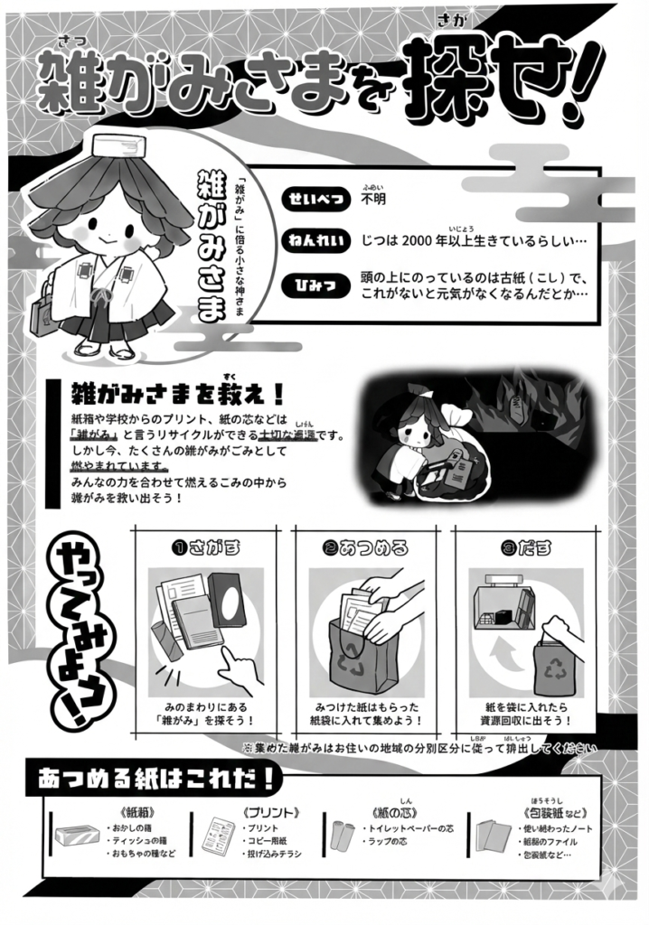 今回ご紹介するのは、古紙リサイクルを楽しく学べる資料「雑がみさまを探せ!」の内容をもとにした、雑がみ分別のポイントです。
