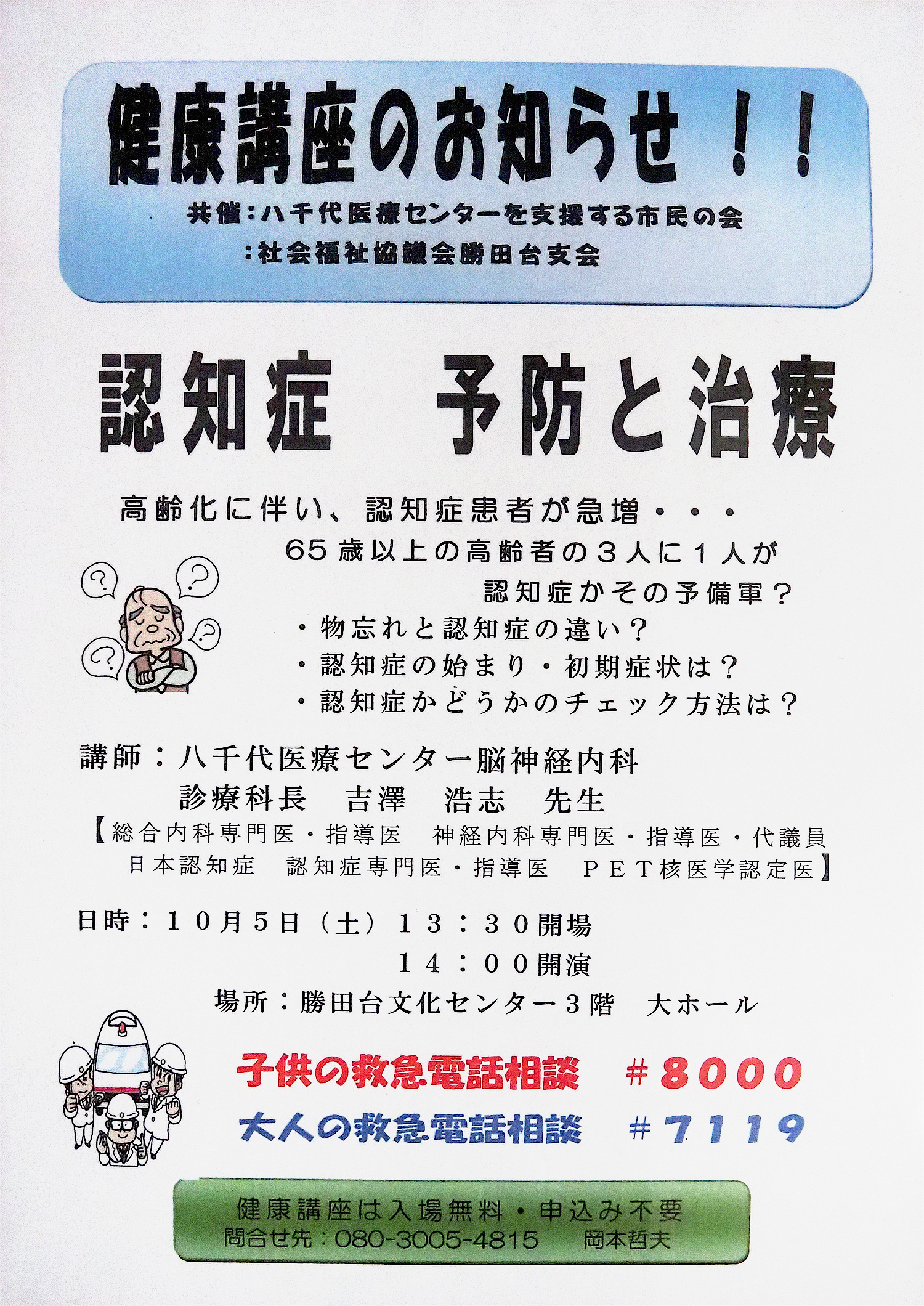 近年、高齢化社会の進展に伴い、認知症患者数が急増しています。 65歳以上の3人に … 続きを読む 健康講座のお知らせ「認知症 予防と治療」